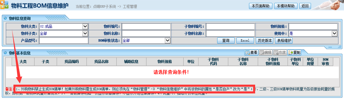 :为什么我在ERP系统中增加的新成品物料,工程人员反馈说找不到这个物料,无法进行BOM设置操作,是什么原因造成的?![]() ![]() 首先,要确保该物料已经成功创建。在:ERP系统-》系统管理-》物料管理-》物料信息维护 中,一定要能找到该物料。 ![]() 然后,在:ERP系统-》工程管理-》生产BOM管理 页面,注意查询条件是否设置有误?将所有约束条件都去除看看。 ![]() 另外,要注意:点晴ERP-》工程管理-》生产BOM管理 页面最下面的说明: