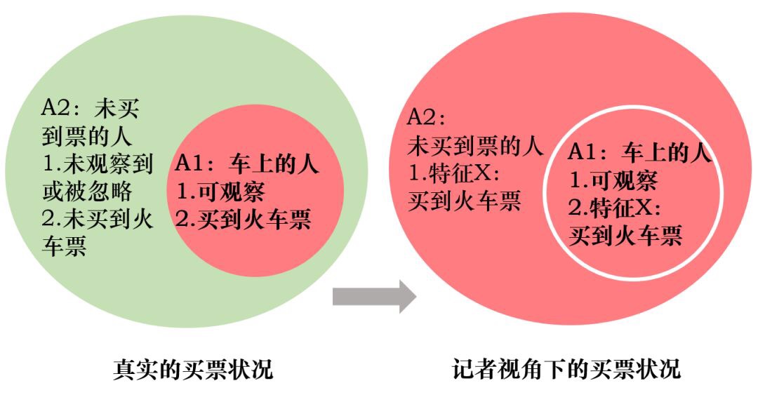 用上述记者调查买火车票的案例来代入解释为:A 为全体想买火车票的人,A1 为已经在火车上的人,A2 为想买但没买到的人,特征 X 为买到票,特征 Y 为未买到票,即幸存者偏差将一小部分显性样本代替了随机样本,从而导致了统计的偏差。