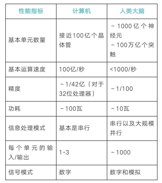 人工智能的讯息一个接着一个,大家是否觉得人的大脑就是比不上计算机?但是,事实并不是这样。今天这篇告诉你,人类大脑比计算机更高效! 作者介绍 骆利群,科研大牛,斯坦福大学人文与科学学院教授,以及神经生物学教授。 大脑是复杂的,每个人类大脑包含约1000亿个神经元,能产生100多万亿个连接。它和另一个复杂的系统,电子计算机,有很多相似之处。 两者都具有强大的问题处理能力,都包含大量基本单元:人脑有神经元,电脑有晶体管。这些基本单元都相连成复杂的环路,处理以电信号形式传输的信息。整体上看,人脑和计算机也有着相似的架构:用于输入、输出、中央处理和记忆存储的环路可以被大致区分开,又能协同工作。[1] 那谁处理问题的能力更强?人脑还是计算机? 考虑到过去几十年计算机技术发展之快,你可能会觉得答案是计算机。的确,通过适当的组装构建和编程,计算机已经能在复杂游戏中打败人类顶尖高手了:上世纪90年代它打败了国际象棋世界冠军,最近Alpha Go打败了围棋顶尖高手,还有百科知识竞赛电视节目《危险边缘》(Jeopardy!)中机器人也获得了胜利。 然而,在我落笔之际,人类仍然能在众多日常任务中更胜一筹,例如在拥挤的城市街道上认出一辆自行车或一个特定的人,例如举起茶杯将它平稳地移到嘴边 ,更不用说大脑还有概念化能力和创造力。 图片来源: Youtube/Fast Solution 那为什么计算机擅长完成某类任务,而人脑在其他方面更为优秀? 人脑 VS. 计算机 我们先来看计算机和人脑的一些对比数据。计算机工程师和神经科学家都曾从计算机和人脑的对比分析中得到过启示。这种对比最早可以追溯到现代计算机时代早期一本简短却影响深远的书:《计算机与人类大脑》(The Computer and the Brain),作者、博学家约翰·冯·诺伊曼(John von Neumann)在20世纪40年代开创的计算机系统结构至今仍是大多数现代计算机的基础。[2] 我们来看看数字上的比较(表1)。 表1中数据,参考文末来源2,3。关于计算机信息,a) 基于2008年的电脑数据;b) 晶体管数量依据摩尔定律(每个集成电路的晶体管的数量每18-24个月就会翻一番),近些年由于能量消耗和热散逸,晶体管的数量增长有所放缓。 速度和精度方面,计算机胜! 从表格对比中可看出:计算机在基本运算速度方面有着人脑难以企及的巨大优势[3]。 现在的个人计算机可以以每秒100亿次的速度执行基本的算术运算,比如加法。 那人脑呢?我们可以根据神经元传递信息的基本过程和的通讯速度来估计大脑中基本运算的速度。举个例子,神经元“激起”动作电位(action potential)被称为“放电”,也就是在神经元细胞胞体附近引发电信号的尖峰(spike),尖峰电位沿着称为轴突(axon)的细胞突起传递,轴突末端又与下游神经元相连。信息以这些尖峰的出现时间和出现频率编码。神经元放电的频率最高大约每秒1,000次。 “放电”示意图。图片来源: gfycat.com/action potential 再举个例子,神经元主要通过在轴突终端特定结构,突触(synapse)上释放化学神经递质来将信息传递给下游神经元,后者将其重新转换为电信号,这个过程我们称之为突触传递。突触传输最快大约需要1毫秒。因此无论是尖峰还是突触传递,大脑每秒最多可执行大约1000次基本运算,比计算机慢1000万倍。[4] t突触传递。图片来源:sciencenewsforstudents.org 计算机在基本运算的精确度方面也占有巨大优势。计算机可以根据分配给每个数字的位(Binary digit,比特,二进制数位,0和1)以期望的任何精度表示数量(数字)。比如,一个32位数字的精度可达2^32分之一,也就是40多亿分之一。 而人脑,由于生物噪声,神经系统中的大多数物理量,例如神经元发放率,只存在几个百分点的可变性,最好的情况下精确度能达到百分之一,仅是计算机的百万分之一。注:神经元发放率常被用来表征刺激强度。 然而,大脑的计算表现既不算慢也不算坏。比如,一个职业的网球选手可以追踪高达160英里/小时速度运行的网球的运动轨迹,移到球场最佳位置,挥动手臂,甩动球拍,将球击回对面,一系列动作发生在几百毫秒之间。 但是,大脑完成所有这些任务(在其控制的身体的帮助下),功耗比计算机大约低十倍。 耗能,人脑胜! 为什么大脑可以做到低能耗? 因为计算机和大脑,两者系统内部处理信息的模式不同。计算机任务主要以顺序步骤执行,这点我们可以从工程师创建顺序指令流的编程方式中看出来。对于这种连续级联运算,每个步骤都需要高度精确,因为误差会在连续步骤中积累、放大。 大脑也使用连续步骤来处理信息。在网球回击的例子中,信息从眼睛传向大脑,然后传向脊髓,从而控制腿部、躯干、手臂和手腕的肌肉收缩。 但大脑还多一个处理方式:大脑还同时采用大规模的并行处理信息,通过利用数量众多的神经元和每个神经元发出的大量连接。 例如,移动的网球会激活视网膜中许多称为光感受器的细胞,这些细胞的作用是将光转换为电信号。电信号随之被并行传送给视网膜中许多不同类型的神经元。只消两个至三个突触传递的时间,球的位置、方向、速度的相关信息已经被不同神经环路提取,并平行地传输到大脑。 移动的网球。图片来源:giphy.com 同样地,运动皮层(大脑中负责有意识运动的部分)会发出平行的指令分别控制腿部、躯干、手臂和手腕的肌肉收缩,这样身体和手臂能同时协调,调整身体到接球的最佳