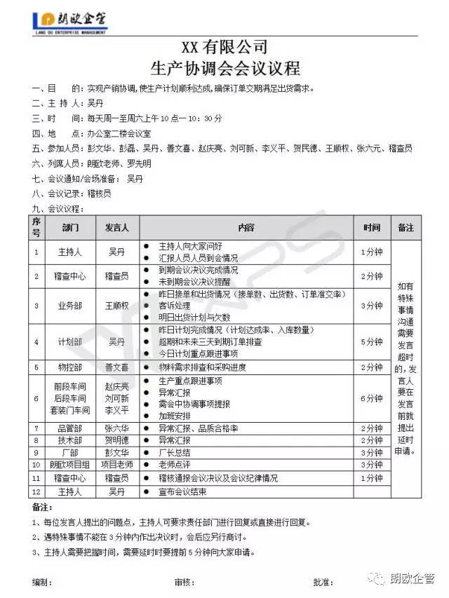 早会台账有一个标准的格式,比如说昨天的产量,昨天本班组的品质达成情况,出勤人数,哪些表现优秀,哪些表现不好的,要批评要表扬的,今天的生产任务,要注意的事项…… 在头一天下班前,班组长最后要做的事情就是把早会台账制订好。到了第二天早上开会,这个班组长无论他有没有上过大学,甚至没上过高中,我想只要能够认识字,因为现在我们施行九年义务教育,文盲应该是几乎是没有了吧,所以,照着这个台账他就可以很好地把这个班组早会开好。 班组长按照这个固定的格式,第一个阶段是照本宣科;第二个阶段是开始加入自己的一些理解的元素;第三个阶段,即使没有这个早会台账,他也能够成为一个合格的班组长,也能够养成对昨天的工作做一个总结,对今天的工作做一个安排,,对团队的培养做一些训练。 照着台账,书读百遍其义自现,我们每天每天这么开早会,保持一个频率,一个月两个月三个月,半年以后这个班组长,我相信一定是一个合格的优秀的班组长。 所以,我们不要去抱怨我们团队,我们的班组长文化素质不高,我们要去培养,我们要用机制去培养。 频率,有的时候比内容更重要。我们不需要前期就开得多有水平,能够讲出多少心灵鸡汤。而且我们说生产管理里面心灵鸡汤也尽量少讲,因为10到15分钟我们没必要去高大上。我们需要做的就是实实在在的,我们前面讲的一些内容:任务的总结、任务的下达、问题的提出和解决。 这是第一个会,由班组长主导每天召开的一个班组早会。 2. 生产协调会 生产协调会又叫生产调度会,是由PMC部门为主导,组织召集生产、品质、技术等跟生产系统相关的各个部门的负责人(主管级以上的)为了调度、平衡生产进度,研究解决各部门、车间不能自行解决的重大问题而召集的会议。 作为异常频发的中小企业,我们每天的生产计划的下达,生产异常的通报,及各类问题的协调使得生产协调会必须召开。每天生产协调会的有效召开,是一个企业生产正常化的保障。 生产协调会召开的内容是什么?