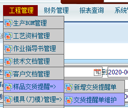 操作步骤:工程管理——样品交货提醒——交货提醒单维护,如下图所示: