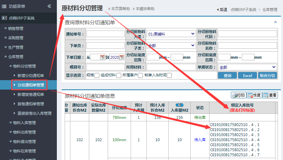 分切入库标签:操作步骤:仓库管理-物料分切管理-分切通知单管理,