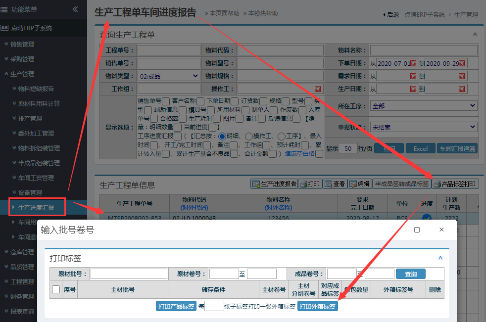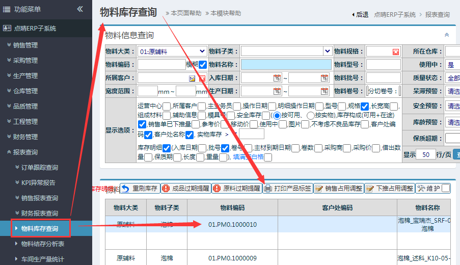 库存标签:操作步骤: 报表查询-物料库存查询, 选择库存明细-点击“打印产品标签”按钮打印: 用途:库存标签一般用于遗失标签补充,可结合点晴MES进行扫码出库,扫码盘点,扫码查询等操作