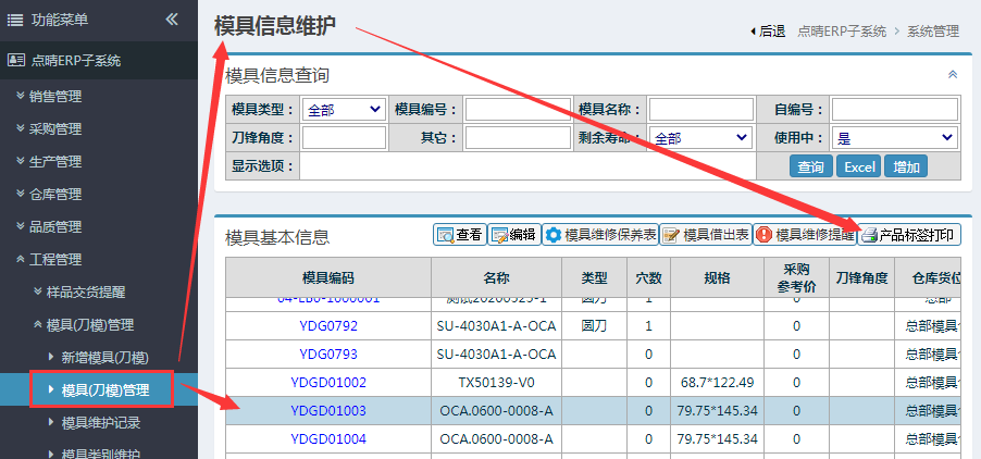 选择模具明细-点击“产品标签打印”按钮打印: