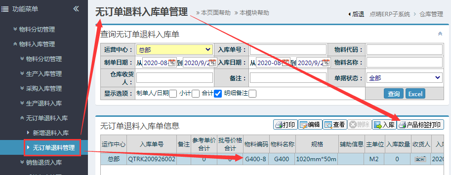 仓库管理-物料入库管理-无订单退料入库-无订单退料管理,