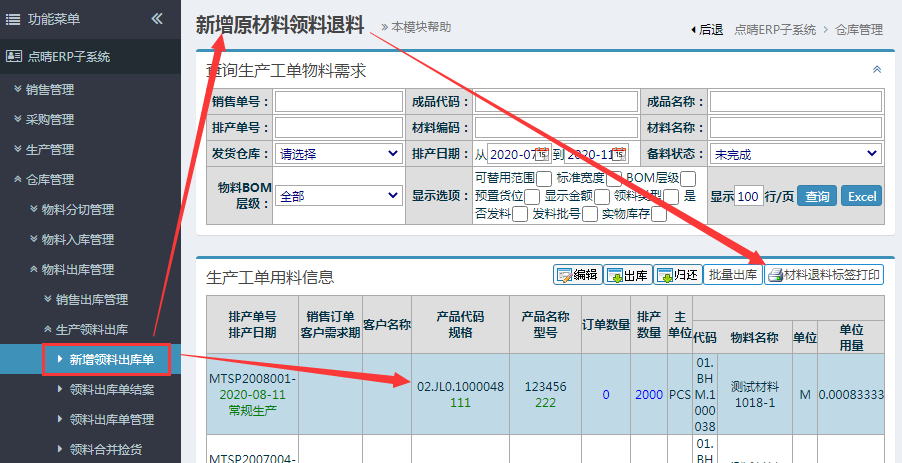 仓库管理-物料出库管理-生产领料出库-新增领料出库单,