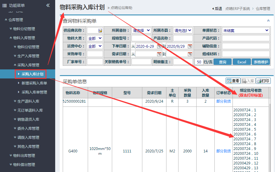 采购入库标签:操作步骤:仓库管理-物料入库管理-采购入库管理-采购入库计划,双击明细“绑定批号卷数”栏制作标签,并打印:
