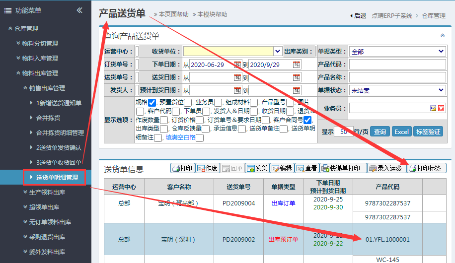 操作步骤:仓库管理-物料出库管理-销售出库管理-送货单明细管理-