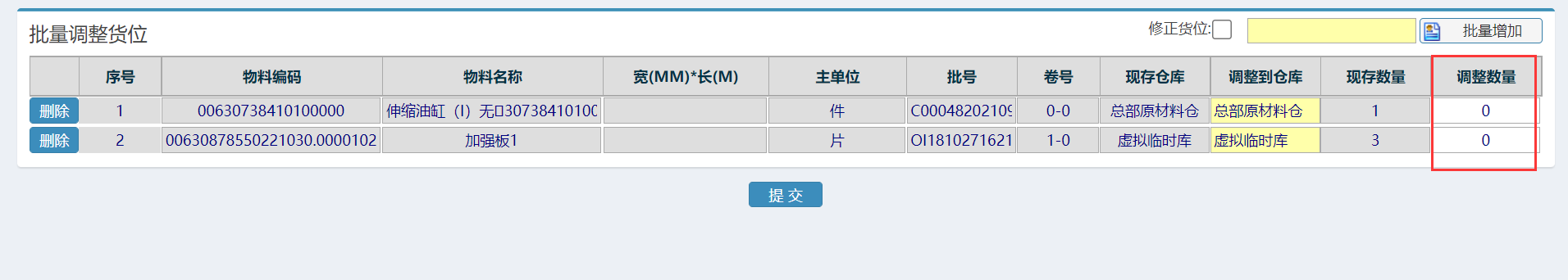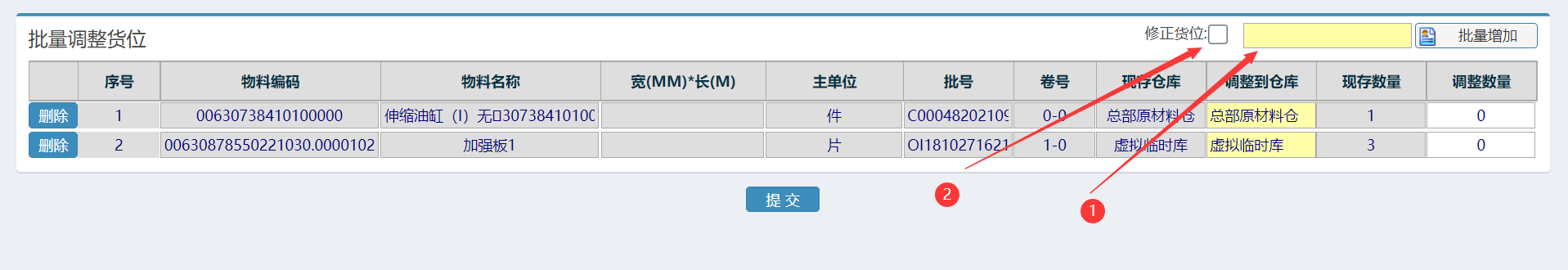 5、如需调整货位,可在黄色方框处单条修改货位。亦可点击最上方的黄色方框处,批量调整货位,然后选择”修正货位“,即可一次性修改全部货位。
