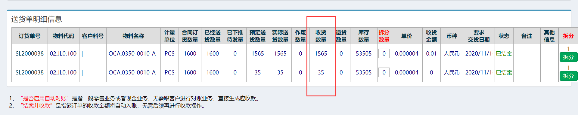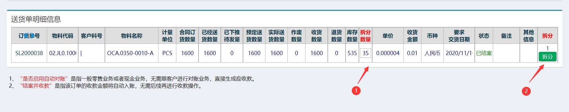 1、进入“送货单发货开票查询”页面。 2、在对应的送货单行处,点击红色箭头处位置,进入拆分送货单页面。