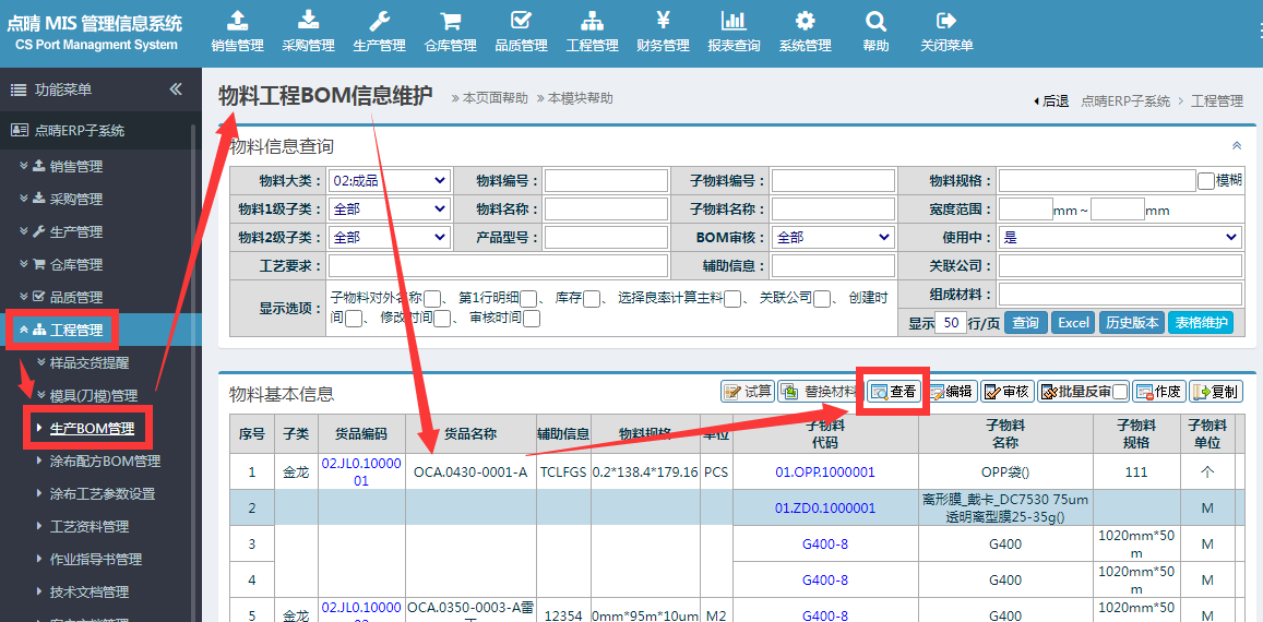 ![]() 进入点晴ERP系统-》工程管理-》生产BOM管理: