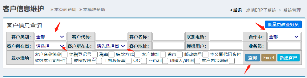 2.首先查询要导出的客户信息,选择查询条件后,点击查询。