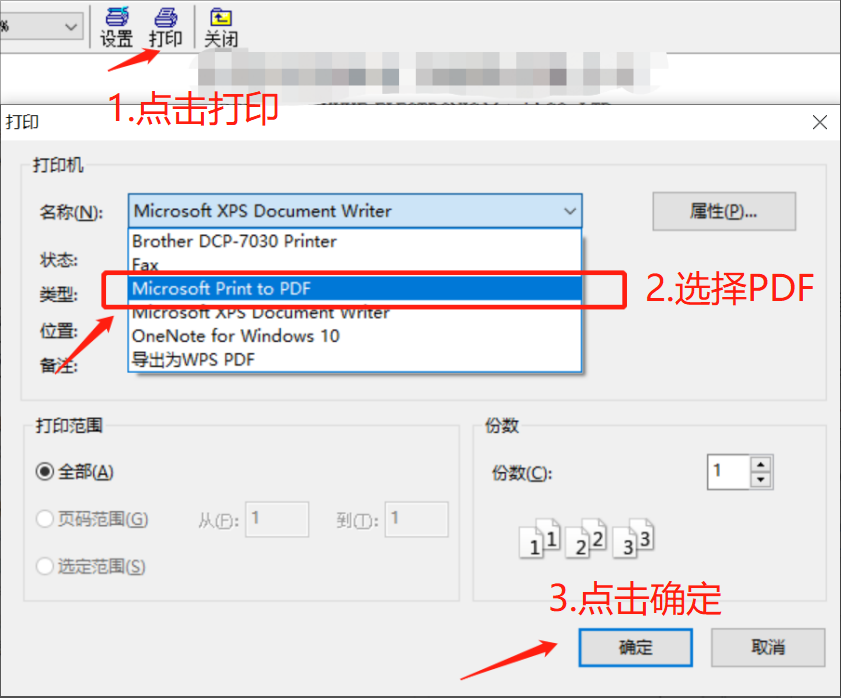 步骤:1-点击打印,2-选择PDF导出,3-点击确定。