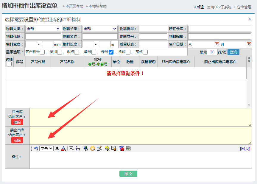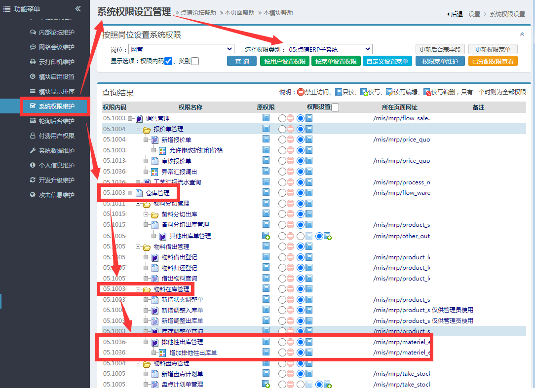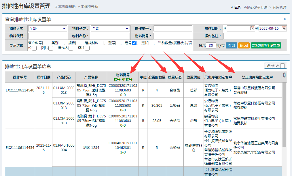 设置位置:系统权限维护设置-》05:点晴ERP子系统-》仓库管理-》物料在库管理-》排他性出库管理: