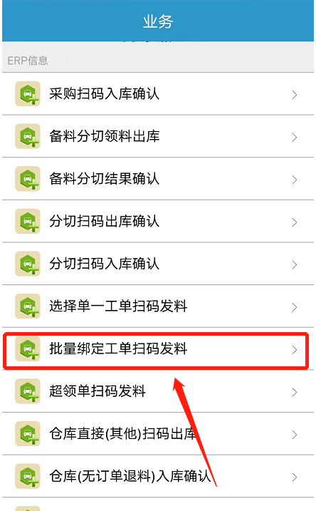 点晴ERP-批量扫码发料操作引![]() 打开点晴业务通APP,点击批量绑定工单扫码发料如下图: