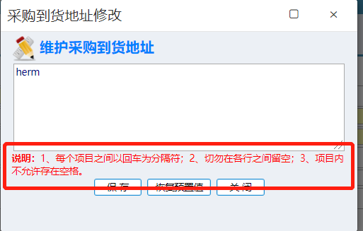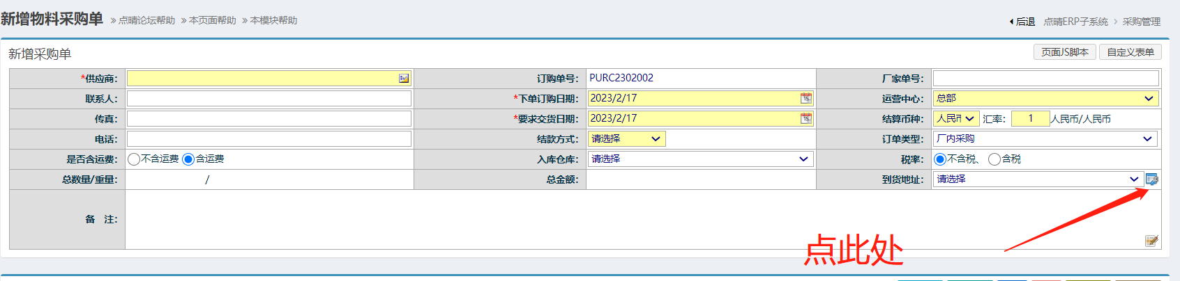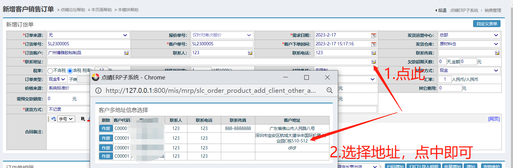 如何设置多客户或供应商到货地址?![]() 新增销售订单时,客户地址可以从客户信息那里直接调取也可以手填,如果有多个地址手填后都会有记录,供下次选择之用。如图所示: 新增采购订单时,到货地址也可以手填,如果有多个地址手动填写后保存。如下图: