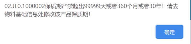 进入库存查询时弹出提示:保质期严禁超出99999天或者360个月或者30年!请去物料基础信息处修改该产品保质期?![]() 弹出提示:保质期严禁超出99999天或者360个月或者30年!请去物料基础信息处修改该产品保质期如下图: