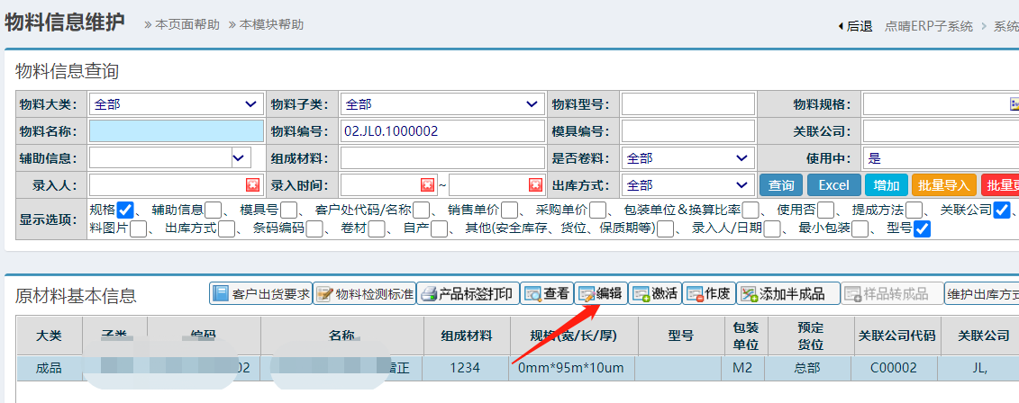 到物料信息维护找到该到物料后,点中后再点编辑如下图:
