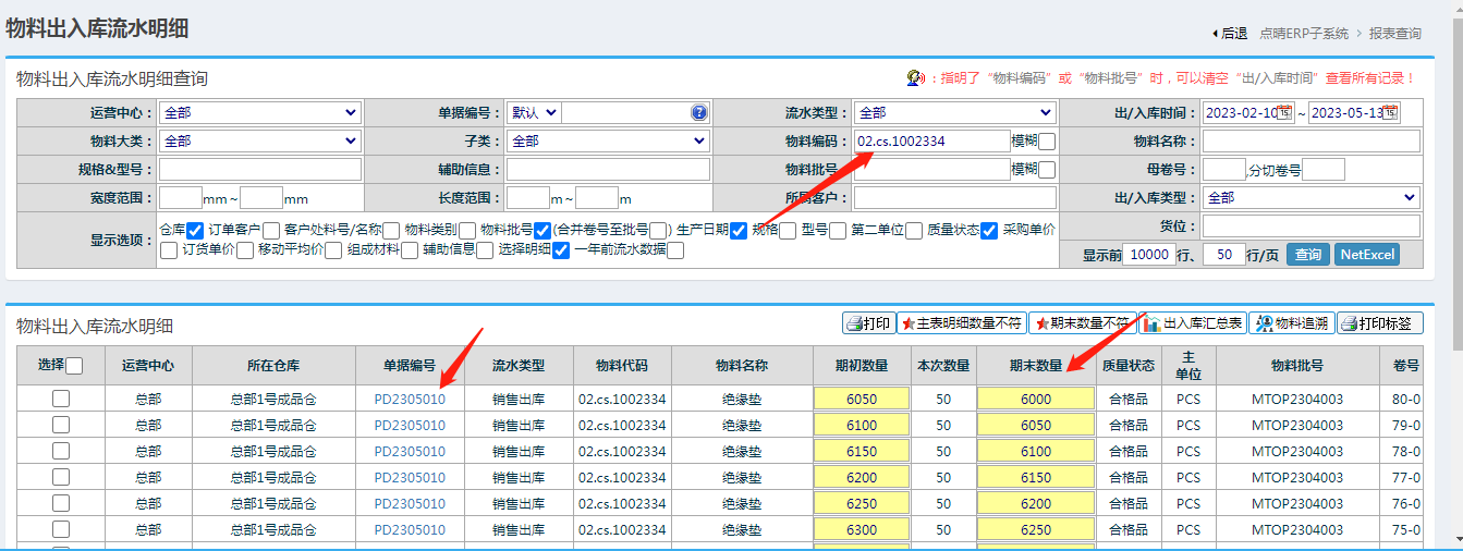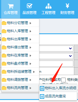 操作步骤:仓库管理-物料流向管理-物料出入库流水明细,如下图:
