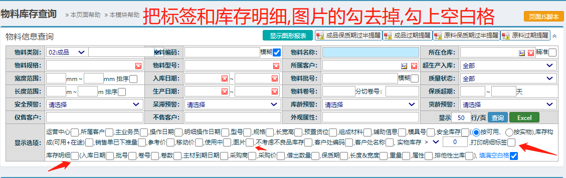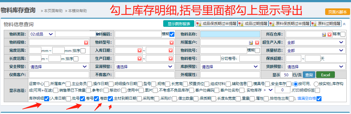 点击进入物料库存查询 如下图: 第一种不按明细导出库存信息,可以导出一个总数库存,一个物料一个总库存 操作方法:把库存明细,明细标签,图片的勾去掉,勾上空白格,然后点击查询 如下图: 查询出结果后点EXCEL进行导出。 如下图: 第二种按库存明细导出,每一行是一个明细库存,一行一个批号,卷号的库存明细,系统按批号卷号来管理库存的 勾上库存明细,要导出的明细项勾上即可,然后查询出结果后点EXCEL 键导出 点晴模切ERP更多信息:https://moqie.clicksun.cn,联系电话:4001861886 该文章在 2025/5/22 10:30:34 编辑过 |