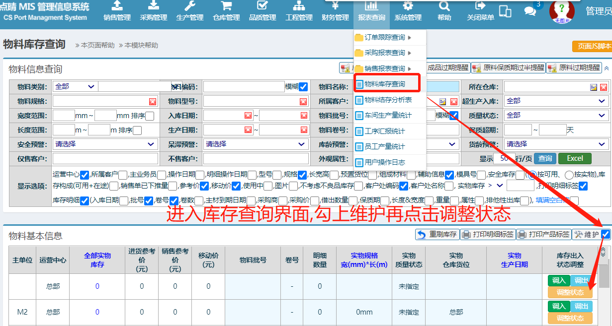 :点晴ERP-在库调整-库存信息仓位调整![]() 情况描述:录入库存信息后,发现手持终端扫码发料扫不出去 提示:库存物料可允许出库的库存数量不足,禁止出库,一般情况由于其他人进行出库造成本次出库库存不足! 如下图: 检查库存信息后,发该批号的物料的仓位均在总部,没有在准确的仓位上。库存必须在准确的仓位上,否则是找不到的,所以提示物料库存不足。 所以要该库存仓位信息调整。 操作步骤: 1. 进入库存查询界面,勾上维护再点击调整状态。 如下图: 2. 在弹出的界面选上具体仓位,然后提交即可。 如下图: 补充说明:若有大量库存信息的仓位不是正确可进行批量操作 相关教程链接: ERP批量调整货位
