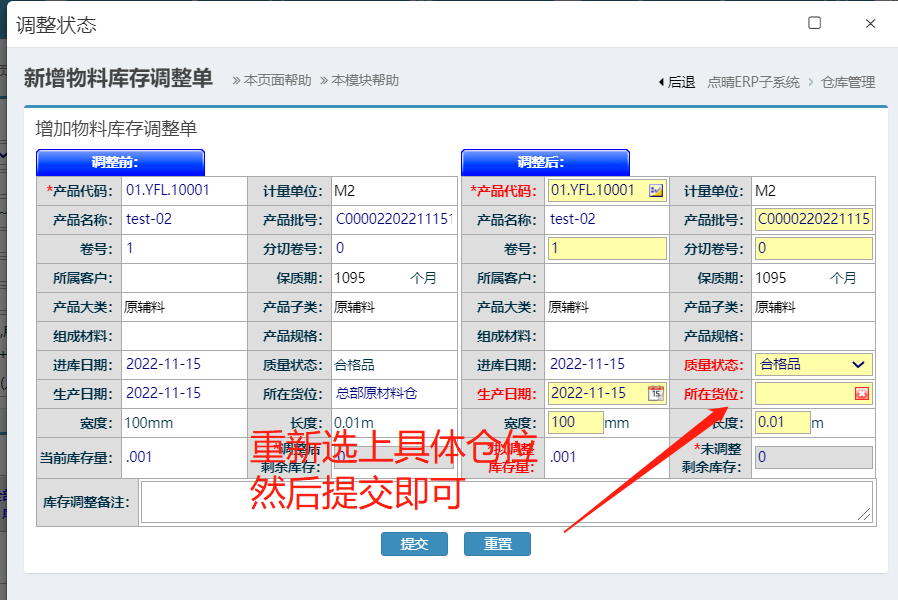 点晴模切ERP-在库调整-库存信息仓位调整