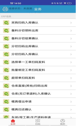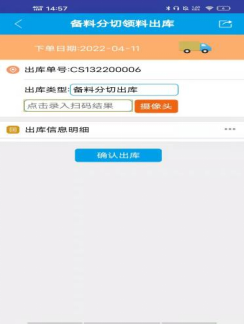 :点晴ERP-可用备料分切操作来调整卷料的宽长![]() 1. 首先从手机端或手持终端上打开点晴业务通.如图所示: 2. 点击”备料分切领料出库”,进入该界面(如图1),对物料上的标签(如图2)进行扫码,扫码过后会出现相应的信息,操作人确认信息无误后点击”确认出库”.