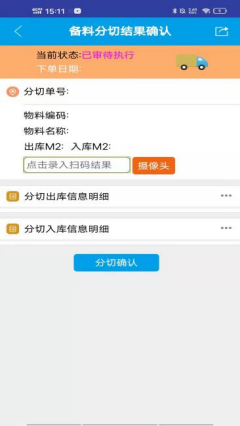 图:1 图:2补充说明:经过上一步操作后,在网页版的ERP系统就会出现相对应的物料信息,但此时的物料信息还没有分切. 3. 点击”备料分切结果确认”,进入该界面(如图1),再次对物料上的标签(如图2)进行扫码,扫码过后对该物料进行分切操作,操作人确认分切信息无误后点击”分切确认”.