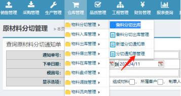 图:1 图:2 补充说明:物料分切确认后,可在网页版的ERP系统进行查看该物料的分切情况. 4. 在谷歌浏览器上登录ERP系统,在”仓库管理-->物料分切管理-->分切通知单管理”进行查看分切好的物料信息.如下图所示:
