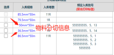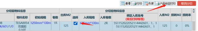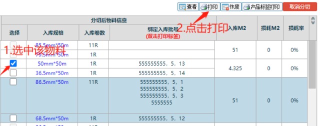 ![]() 图:1 图:2 5. 然后勾选上分切好的物料,进行标签打印,把打印好的标签重新贴上分切好的物料上.