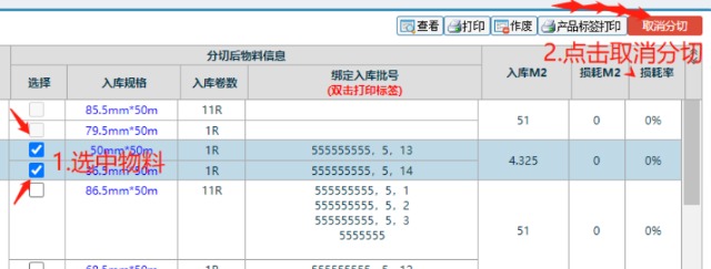 ![]() 图:1 6. 如果发现物料分切信息出现错误或想要更改的话,进行以下操作:在该页面下选中需要更改物料的分切信息,选中后点击”取消分切” 取消分切后,该物料会回到未分切的状态,需要重新对物料进行分切,即重复一次步骤3的操作.