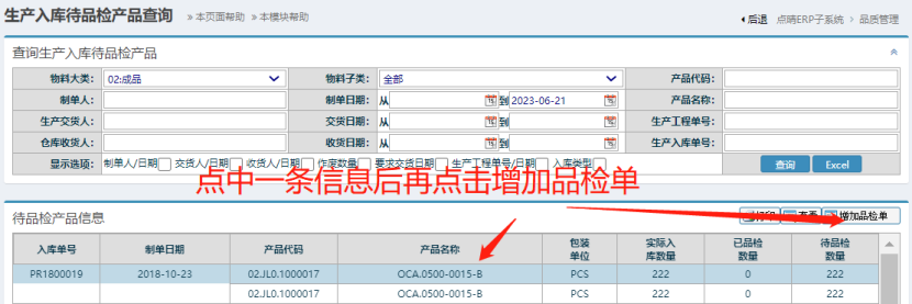 :点晴ERP-新增生产成品品检入库单![]() 1. 点击进入 如下图: 2. 点中需要增加品检的物料,再点击增加品检单 如下图: ![]() 3. 录入信息后提交即可 如下图: ![]()