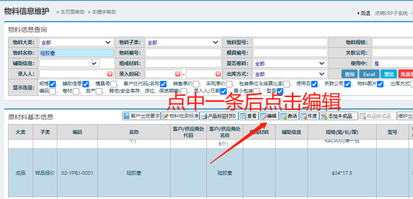 :点晴ERP-基础资料如何上传成品或原材料图片![]() 1. 点击进入 如下图: 2. 点中一条信息后点击编辑 如下图: