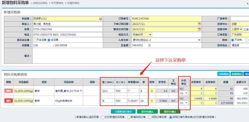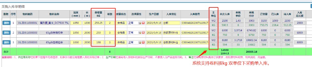 【点晴模切ERP】离型纸采购时按照重量公斤下单,仓库入库时有80卷需要单独称重入库,工作量很大,能否只入库一个总重量啊?