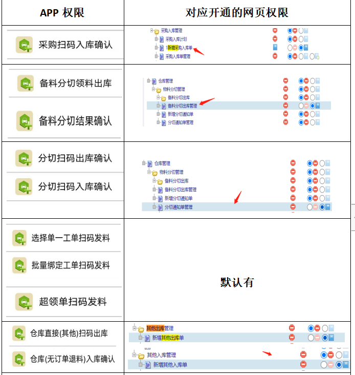 权限赋予对应app功能菜单显现清单: