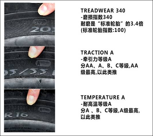 很多网友和车主朋友们对于轮胎Treadwear / Traction / Temperature这三个指数并不是很熟悉,或者了解不深入,以致产生对各厂牌轮胎进行选择时容易出现歧义和误区,为此我们专门带着大家一起来看看三“T”指数究竟有什么意义。认证信息 / 轮胎产地 / 工厂代码 / 生成日期在这里小编在唠叨一句,轮胎达到磨损标准,或者生产日期超过6年轮胎最好别用了,轮胎一旦达到这个时间段,质量骤减!越野轮胎类型:如果你是爱车达人,那么你应该也喜欢越野。那越野胎分几种呢?AT是指适用于全路况的越野胎,MT是指适用于专业越野路面的越野胎,HT是指适用于城市路面的越野胎。很多车主在升级轮胎的同时还会升级轮毂,这里就涉及到了另一个和轮胎宽度数值对应的数值,轮毂J值。轮胎的J值就是轮毂的宽度。轮毂的J值有一个对应的表格,例如上图写着16x61/2J(16x6.5J),对照表格,轮毂的宽度选择范围(195-215),选择205为最佳!不同的轮胎宽度、扁平比、轮毂半径,对应的轮胎直径不同,角速度相同的情况下,轮胎行驶速度和仪表台显示数字就会产生偏差!这时,我们可以借助一个小工具“轮胎计算器”。百度汽车之家轮胎计算器,输入前后轮胎宽度、扁平比、轮毂半径,计算出更换前后的误差值。例如我们把195 65 R15轮胎换成215 55 R17的轮胎,计算得出实际车速100km/h时车速表显示为98.098km/h,在限速路段,你的行驶速度要稍慢些!