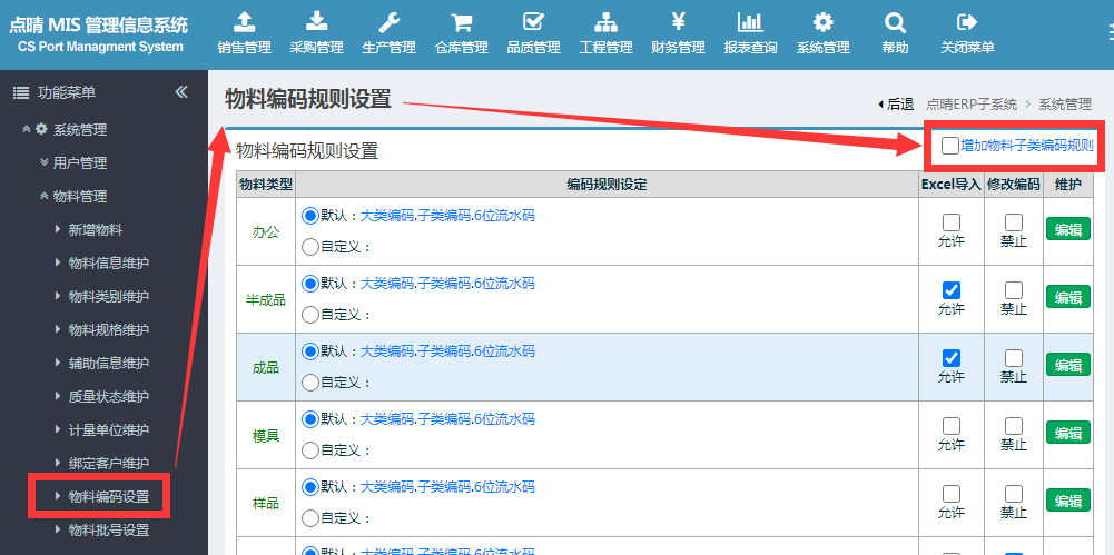 请问点晴模切ERP中支持对不同类别的物料单独设置物料编码规则,并自动生成物料代码吗?
