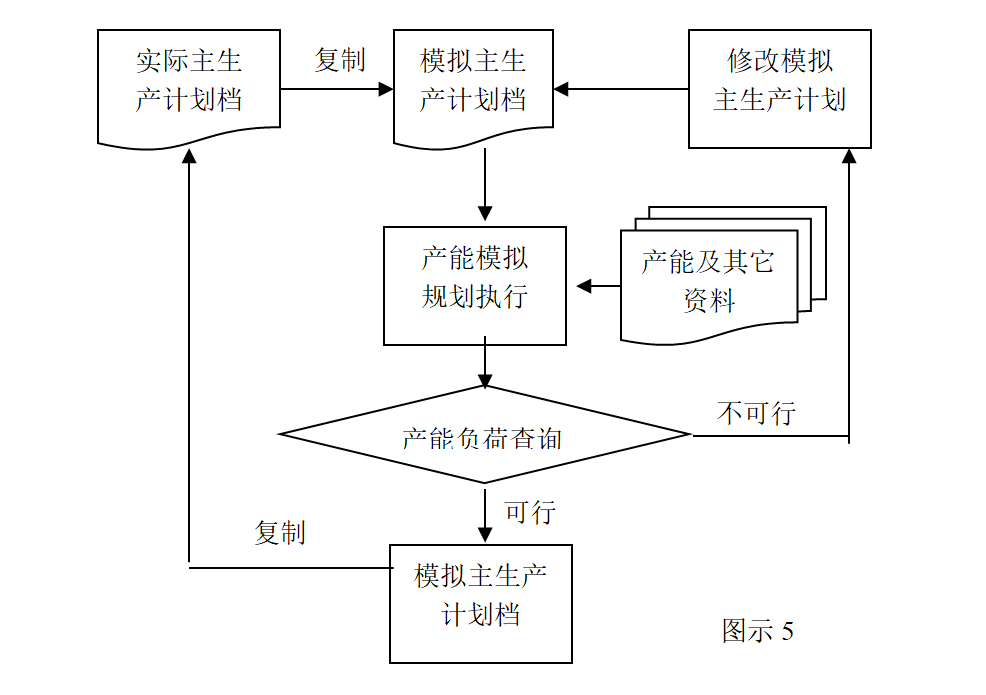 2)主生产计划(MPS)的模拟需求活动产生了生产规划,生产规划决定了主生产计划MPS,而MPS必须可行,为保证MPS是可行的,需要在物料需求计算之前有一个粗资源平衡过程,建立一个粗能力计划,此过程称作主生产计划(MPS)的模拟。 MPS的模拟过程(图示5)如下: 1)复制一份现有MPS,在此MPS的基础上进行修改。 2)按照MPS内容进行生产能力模拟。 3)查询各工作中心(WorkCenter)生产能力与负荷是否平衡。 4)在不平衡情况下,可以调整模拟MPS。 5)不断地进行生产能力模拟,平衡与调整直至平衡为止,将平衡状况的模拟MPS复制到实际MPS中去,作为正式可行的MPS。