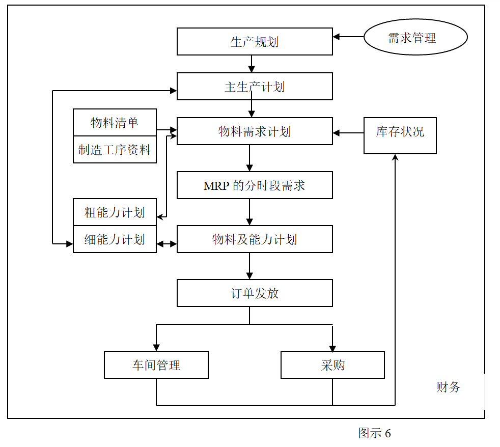 3)能力需求计划(CRP)能力需求计划(Capacity Requirements Planning简称CRP)将生产计划和各种生产资源结合起来进行管理和计划。CRP的建立一方面能对设备和人力进行充分的利用,另一方面能减少加工等待时间,缩短生产时间,为生产管理人员提供能力与生产的信息。 CRP生产核定内容有以下几个方面: 1)核定各设备组的生产能力。 2)核定小组、工段、车间的生产能力。 3)确定工厂的生产能力。 CRP的计划方法有两种: 1)基于工作负荷累加的无限能力计划。 2)基于优先权分配的工作中心的有限能力计划。 CRP生产能力与负荷的平衡工作: 包括生产能力计算、生产负荷计算、生产能力与生产负荷平衡及做出能力平衡计划。 (四)制造资源计划(MRPII)将MRP的信息共享程度扩大,使生产、销售、采购、财务、工程紧密结合在一起,共享有关数据,组成了一个全企业级生产管理的集成优化模式,它就是制造资源计划(MRPII),如图示6。 物料需求计划称作为狭义的MRP,而制造资源计划称作为广义MRP或称为MRPII,它是一个制造业所公认的标准系统。 MRPII是由闭式MRP加上账务的功能所组成的集成系统,它是管理科学、经济学、会计学、计算机技术、通讯技术等学科及技术综合的产物。