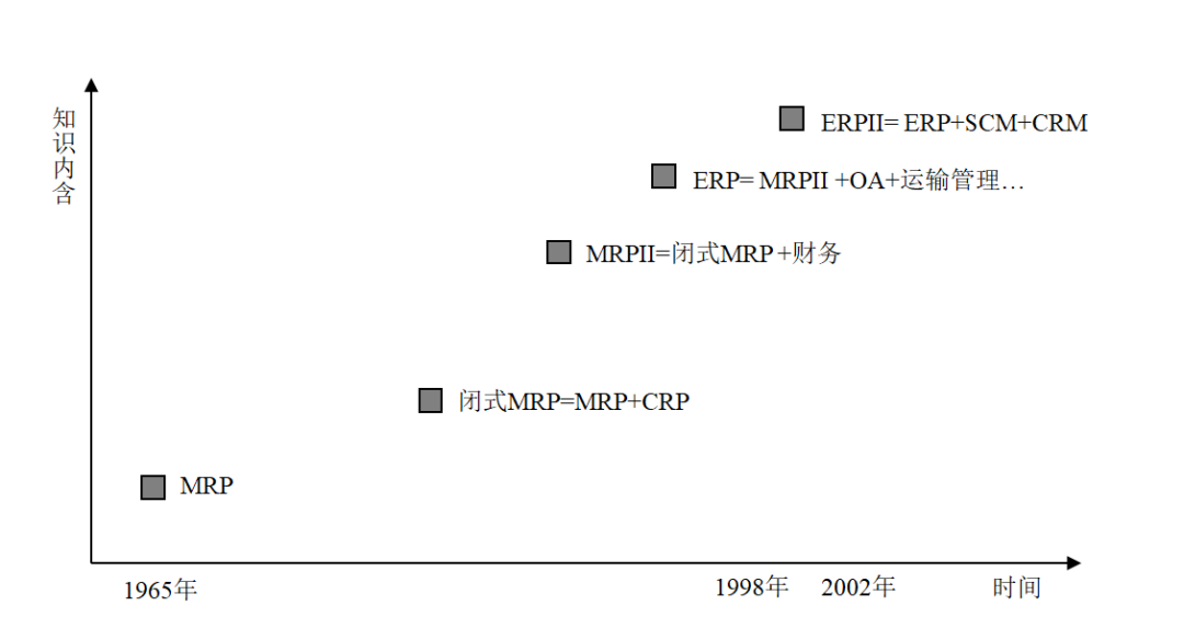 图表7 (六)企业资源计划(ERP)的发展历程上面的文字,以时间为轴线,知识内容由浅入深的方式,对企业资源计划(ERP)的发展历程及相关知识点进行了简要论述,下图是关于企业资源计划(ERP)以这两个方面为轴线的直观表述。