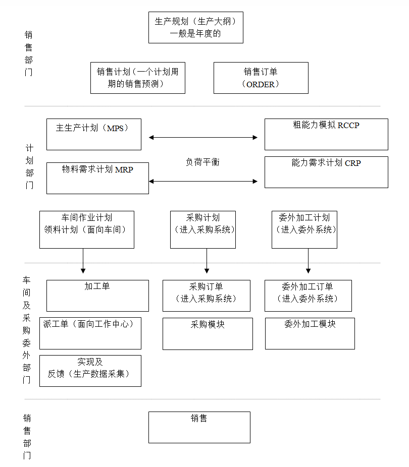 2、生产计划及作业流程概述 生产计划及作业流程概括为:四个计划,四个实现,三条流。 四个计划指主生产计划时代(MPS)、粗能力需求计划(RCCP)、物料需求计划(MRP)、能力需求计划(CRP); 四个实现:采购、委外加工,车间作业,销售。 三条流:物流、资金流、信息流。