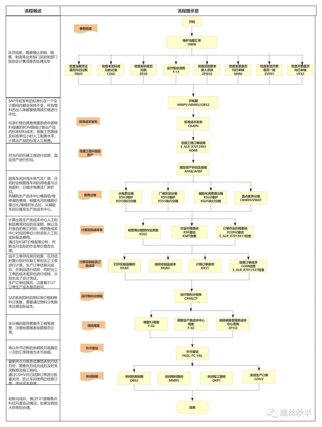 ![]() 成本月结流程 一、事前检查 昨日更新了SAP成本月结前的准备工作,今天将介绍结账流程。使用SAP的企业一般是在次月初对上月成本进行结算,通常需要在两个工作日内处理完毕。 在结账前,需要再次确认采购、销售、制造等业务部门及财务部门其他会计事项是否处理完毕。如果还有发票未过账等情况,可以先等相关人员处理完毕再进行结账。为提高效率,等待时间可以先用OB08维护当期的月结汇率。 确认相关人员处理完账务后,方可打开账期。(月结时间紧,任务重,最好还是要求相关人员在月底将事项处理完毕) 二、CK40N标准成本 SAP月初发布的标准价在一个会计期间内都会保持不变,所有物料的出入库都要使用该价格进行评估。 标准价格估算是根据系统中各物料搭建的BOM路线计算出产品的标准材料成本;根据工艺路线及标准单位小时人工制费水平,计算出产品的标准人工制费。 三、在建工程&固定资产结算 用S_ALR_87012993查看当月的在建工程,用KO88对当月的在建工程进行结算,注意结算前查看结算规则是否对应; 用AFAB对固定资产进行折旧;用AFBP查看折旧运行结果。 四、费用分摊 因各车间共用水电气及厂房,月结时会根据各车间的用电量与占地面积,分摊水电费及厂房折旧。 辅助车间模具组和维修课会帮助车间制作模具、修理设备等,月结时要把辅助生产成本中心模具组/维修课的费用按照当月的模具价值占比或维修时长占比,从辅助车间分摊至生产类成本中心。 五、计算实际成本率 计算出各生产类成本中心人工和制造费用对应的总金额,除以当月各自的报工时间,得到各成本中心对应的单位小时实际人工和实际制造费用。 通过与KSBT价格报表分析,判断当月实际的作业单价是否合理。 六、计算在制品及订单成本 由于工单存在跨月结算,在月结时需分别对在制工单和完工工单进行计算。生产订单结算完成后,在制品进行结转,同时完工工单的成本差异也进行结转,分别生成了会计凭证。 生产订单结算后,注意看3127订单生产成本是否结平。 七、运行物料分类账 SAP系统同时启用标准价格和物料分类账,需要通过物料分类账来还原实际成本。将库存差异(原材料-材料成本差异、库存商品-自制半成本差异、库存商品-自制产成品差异)自动按当期库存出库数和库存结存数的比例分摊至成本和库存中。 日常需要外购件的标准价格、BOM和工艺路线进行检查,避免因标准价格与实际价格差异过大而形成未分摊差异。 八、结转尾差 跑完物料分类账后,93科目及成本中心会有一些尾差。产生未分摊差异的原因很多,此处不再赘述。未分摊的差异需要手工做笔调整,注意检查尾差金额是否正常。 九、外币重估 将以外币记账的余额按月底最后一天的汇率转换为本币余额,后续出期推文详解,此处也不再赘述。 十、关闭账期&检查 避免将次月账务或事项弄到月结月份,需要在月结完成后及时关闭账期及报工期间。 通过COHV对已结算订单进行批量关闭,防止车间再次使用已结算过的订单,造成成本异常。 结账完成后,通过F.01查看重点科目月度变动情况,如果没有较大异常则合理。 点晴模切ERP更多信息:https://moqie.clicksun.cn,联系电话:4001861886 该文章在 2023/11/16 22:34:01 编辑过 |