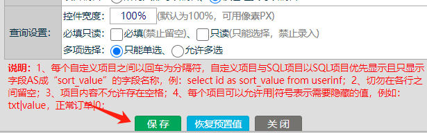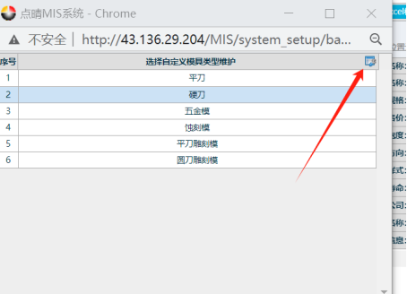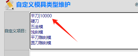 :点晴ERP-如何给刀模类型绑定一个寿命![]() 点击进入 打开选择框 然后点击此处 如下图: 在类型名称后面加上| ,然后再填上数字 如下图: 最后保存即可 ![]()