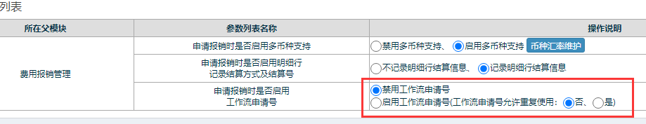 进入“设置-其他参数维护-申请报销时是否启用工作流申请号”,选择“启用”。
