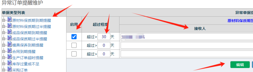 点击原材料保质期,然后勾上启用,设置天数,接收人,最后点击编辑 如下图: