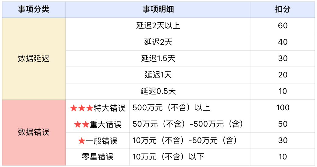 数据延迟和数据错误可同时适用(例:某部门财务结账前提交数据延迟1天,扣20分;财务结账后发现提交的数据有一般错误,扣30分,合计当月扣50分)。
