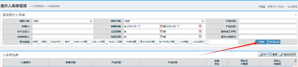 操作步骤: 仓库管理-物料入库管理-委外入库管理-委外入库单管理