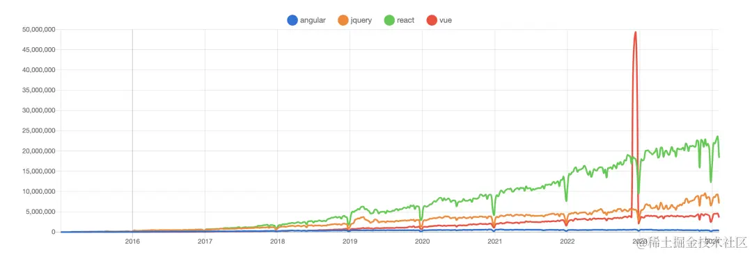 FormData 支持 jQuery.ajax 添加了对二进制数据的支持,包括 FormData。 此外,jQuery 4.0 还删除了自动 JSONP 升级、将 jQuery source 迁移至 ES 模块;以及添加了对 Trusted Types 的支持,确保以 TrustedHTML 封装的 HTML 能以不违反 require-trusted-types-for 内容安全策略指令的方式用作 jQuery 操作方法的输入。 由于删除了 Deferreds 和 Callbacks(现在压缩后不到 20k 字节),jQuery 4.0.0 的 slim build 变得更加小巧。 还有人用 Jquery 吗?随着现在前端发展的迅速,越来越多人投入了 React、Vue 的怀抱,这意味着越来越少人用 Jquery 了,而且用 Jquery 的基本都是老项目,老项目都是求稳的,所以也不会去升级 Jquery 所以我不太看好 Jquery 后续的发展趋势,虽然曾经它真的帮助了我们很多 虽然如此,现阶段 NPM 上,Jquery 的下载量依旧是 Vue 的两倍