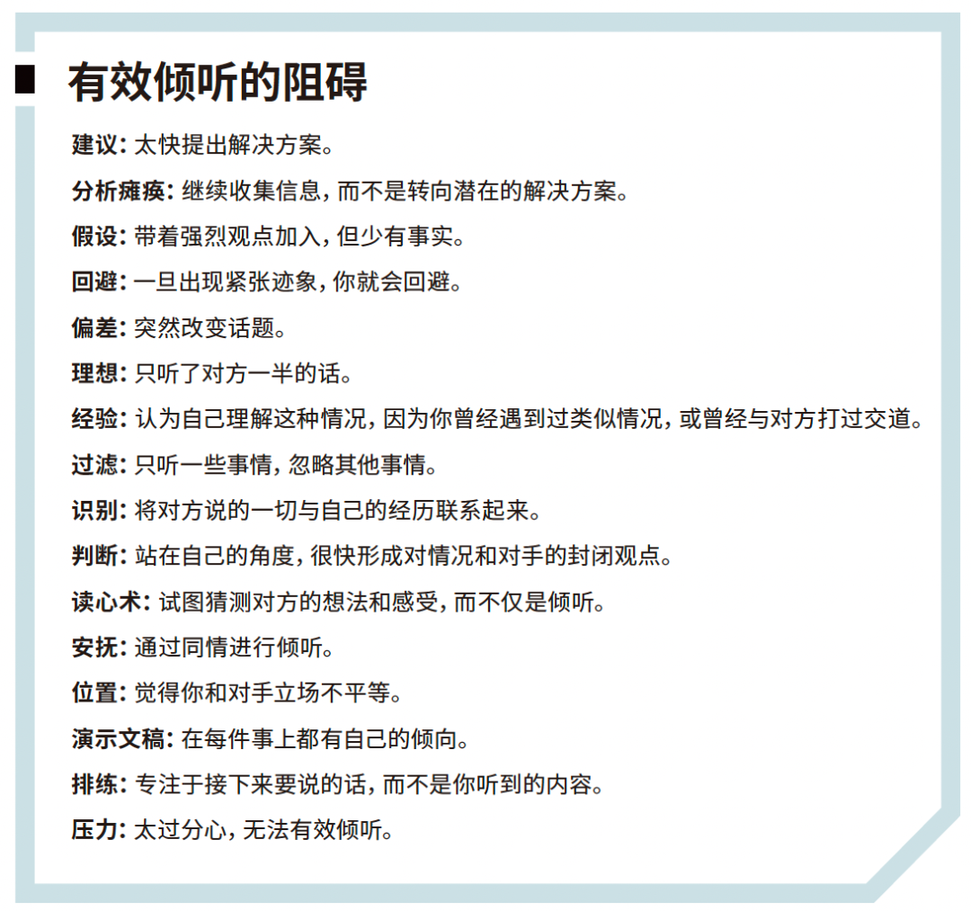 无论情况如何,谈判者必须记住,唯一能让别人朝着你的方向前进,并找到一个你同意的解决方案的方法,是深入倾听和理解,保证对方感到被看到、听到和理解。双方意见不合时,这样尤其有效。它使你能够建立信任,管理预期,并找到满足对方关键需求的方法。