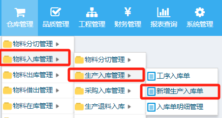 操作步骤:仓库管理-物料入库管理-生产入库管理-新增生产入库单,如下图所示: